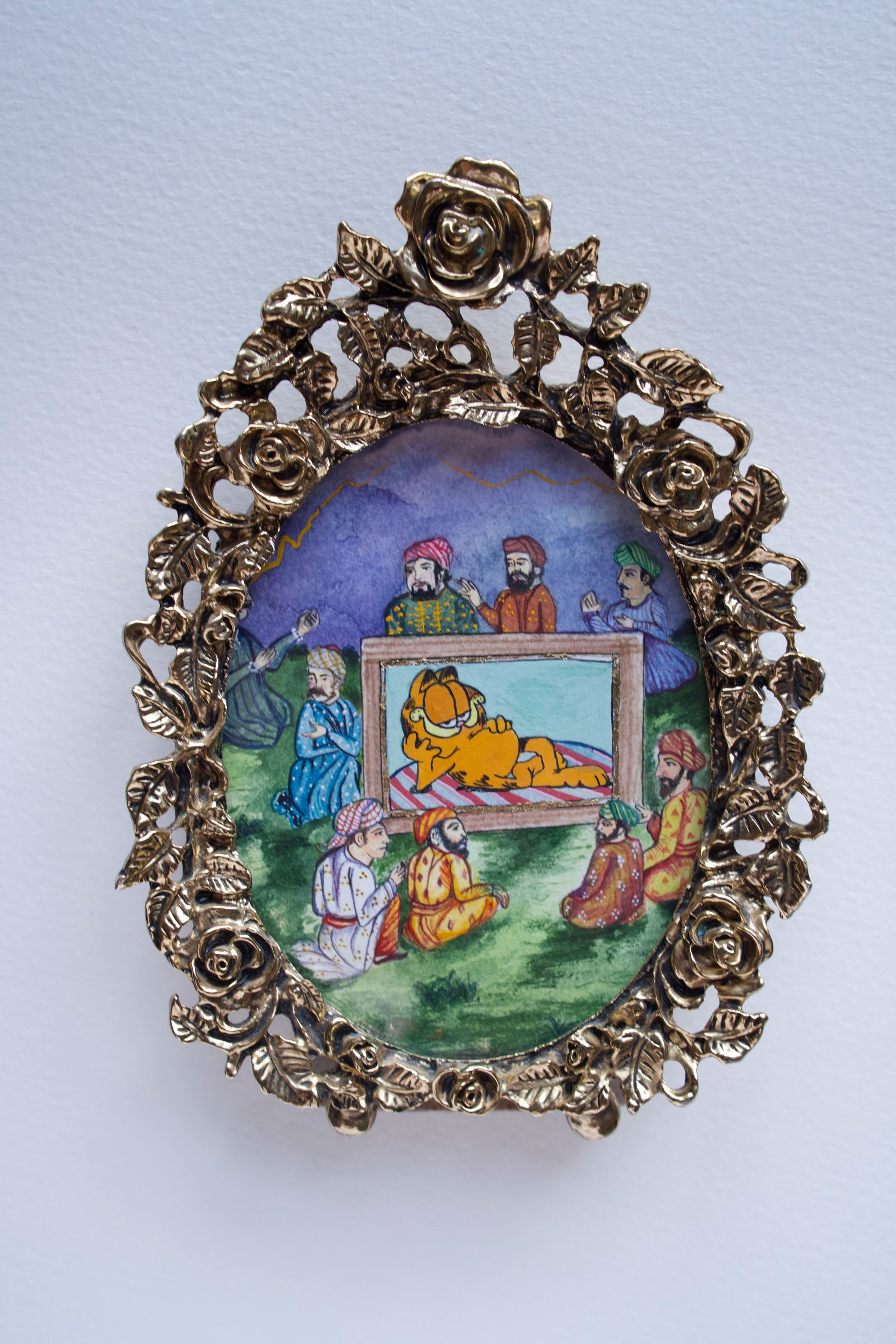 The whole idea to add yet another layer into my work, a layer in the form of an adorned gilded frame, came from the Pakistani artist Mohsin Shafi. His work is so intricate but for me it all makes sense and comes together when he places these beautiful hand-cut collages inside elaborate and heavily decorated frames. I, too, wanted to experiment with that idea and see how the painting and the frame interacted with one another, how the feeling of it changed instantly, because now the cartoon character is not the only contemporary element in the artwork, but the frame as well.